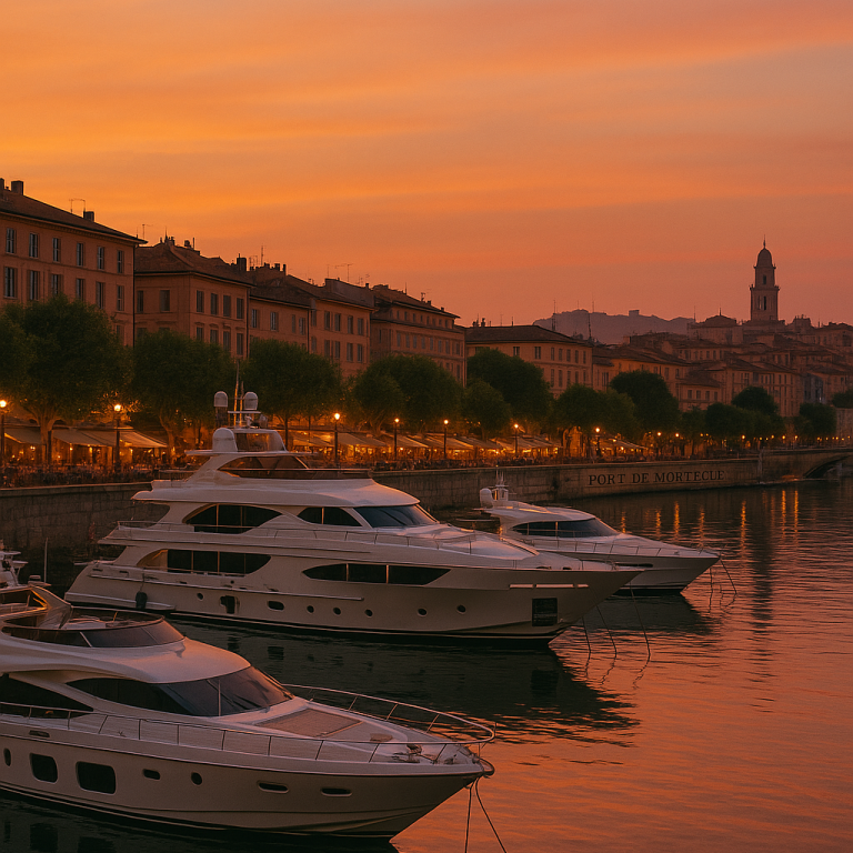 A picturesque marina lined with yachts, palm trees, and seaside cafés — perfect for evening strolls and coastal dining.