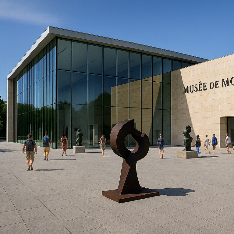 A striking glass-and-limestone art museum featuring modern and contemporary French art, with a sculpture plaza and café.